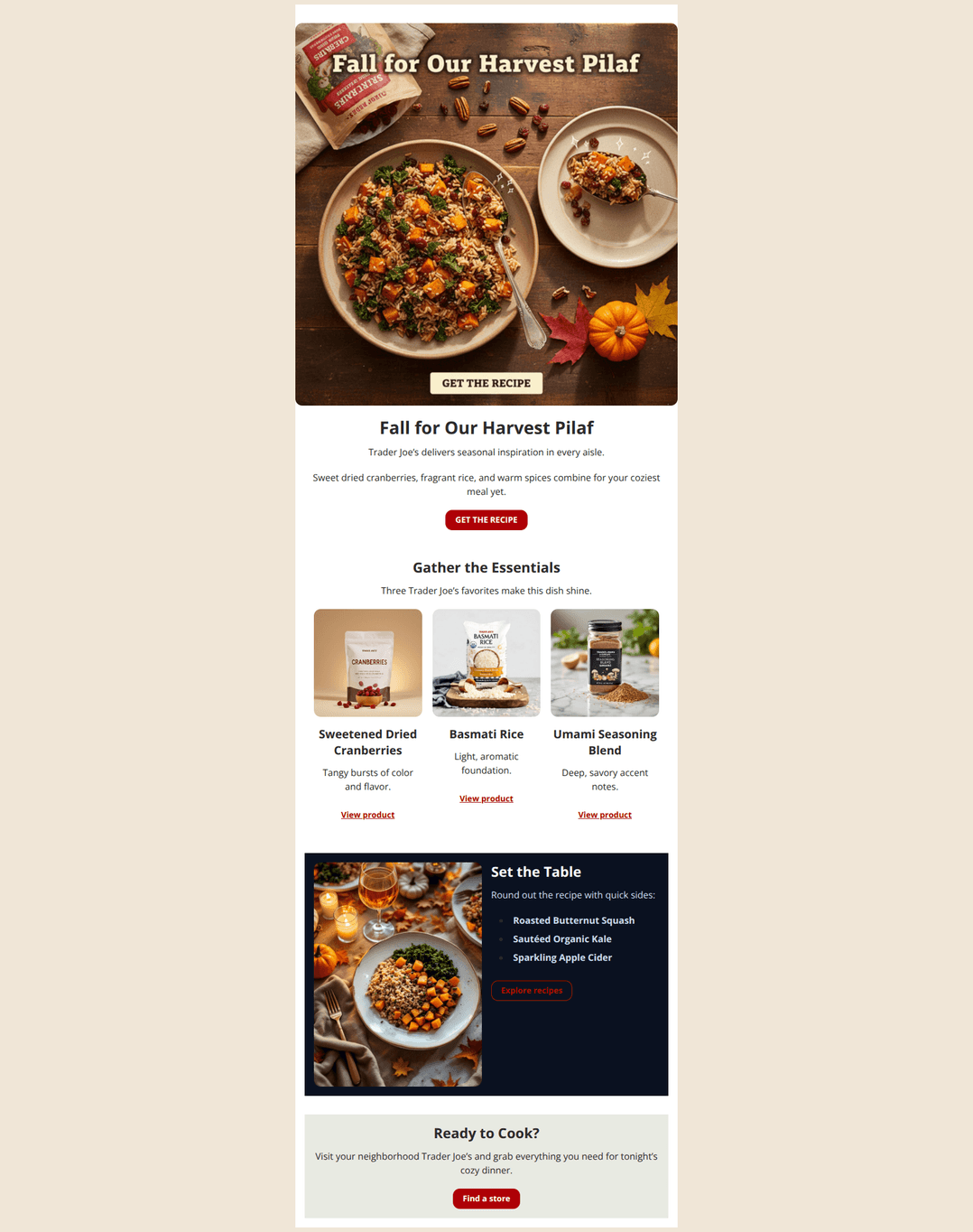 Seasonal, on-brand email that marries an appetizing hero with a tight product trio and a clear path to the recipe. Biggest gains come from strengthening mid-funnel CTAs (ingredients β action), linking the βSet the Tableβ list items, reducing duplicate hero messaging, and adding quick-scanning cues (time/serves, dietary tags). Personalization and bundled ingredient actions can further improve conversion.