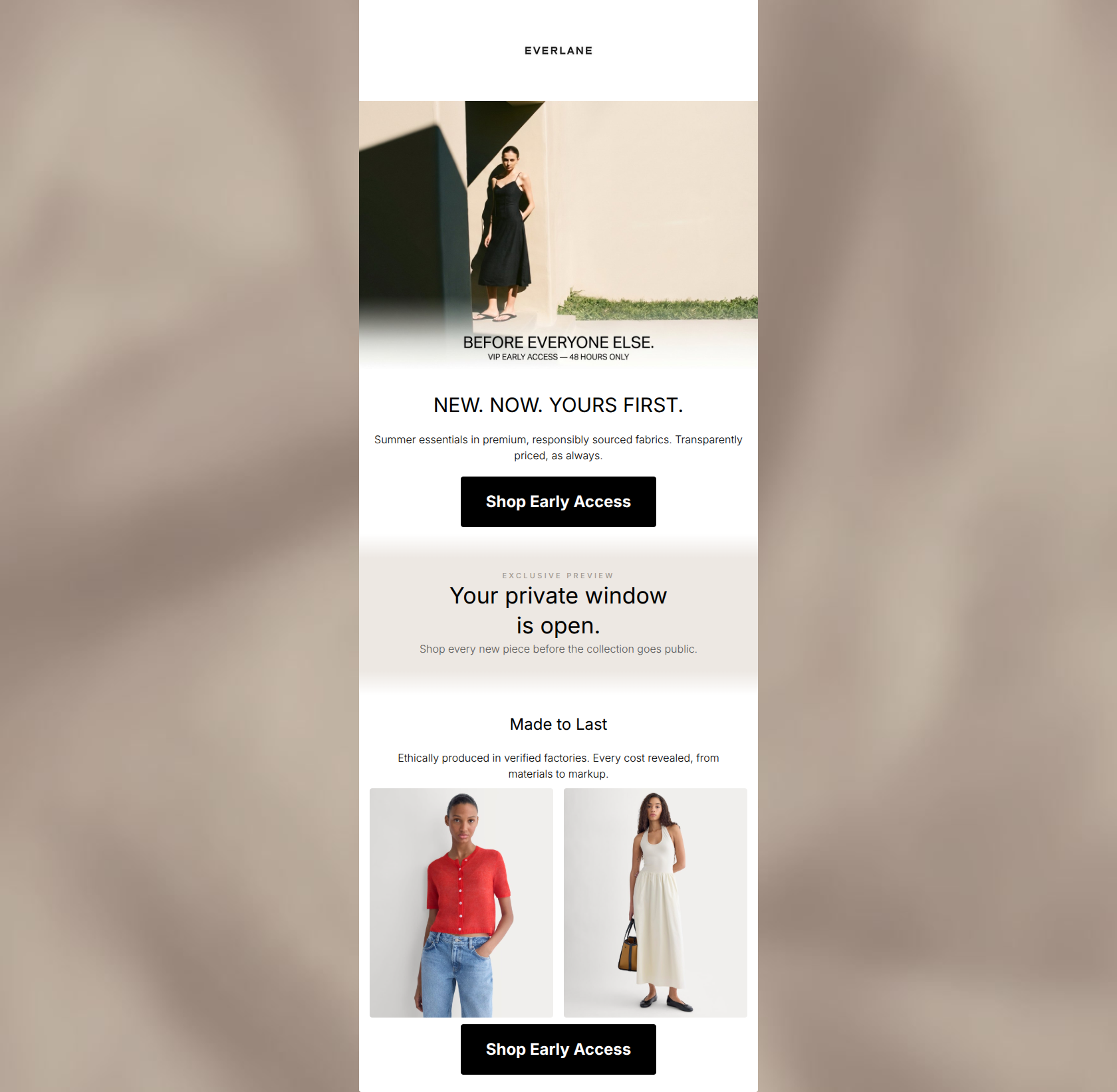79/100This is a solid, visually aligned email that effectively leans into Everlane's core brand pillars of exclusivity, transparency, and ethical production. It successfully creates urgency ('48 HOURS ONLY') without resorting to cheap discounting. However, it suffers from significant message repetition—restating the 'early access' angle three times—and introduces a slightly muddy visual element in the middle banner that distracts from the otherwise crisp, editorial aesthetic. By tightening the word economy and ensuring product imagery matches the seasonal promise, this could easily be a top-tier performer.