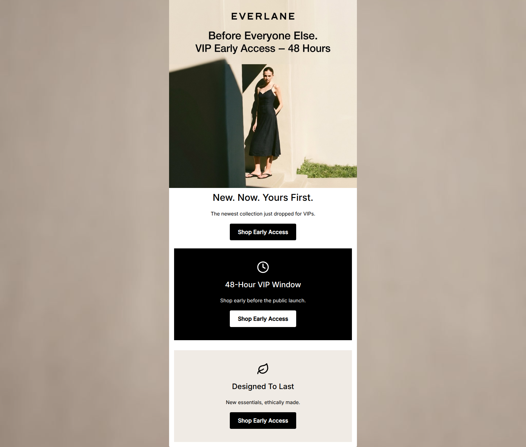 This email is visually pristine and aligns perfectly with Everlane's minimalist aesthetic, but it suffers from a severe lack of content strategy. It relies entirely on the 'VIP' psychological hook while fundamentally failing to merchandise the actual product. The messaging is highly repetitive, hammering the '48-hour early access' point across three separate sections without ever showing the customer what they are getting early access *to*. It functions as an alert rather than an enticing invitation to shop.