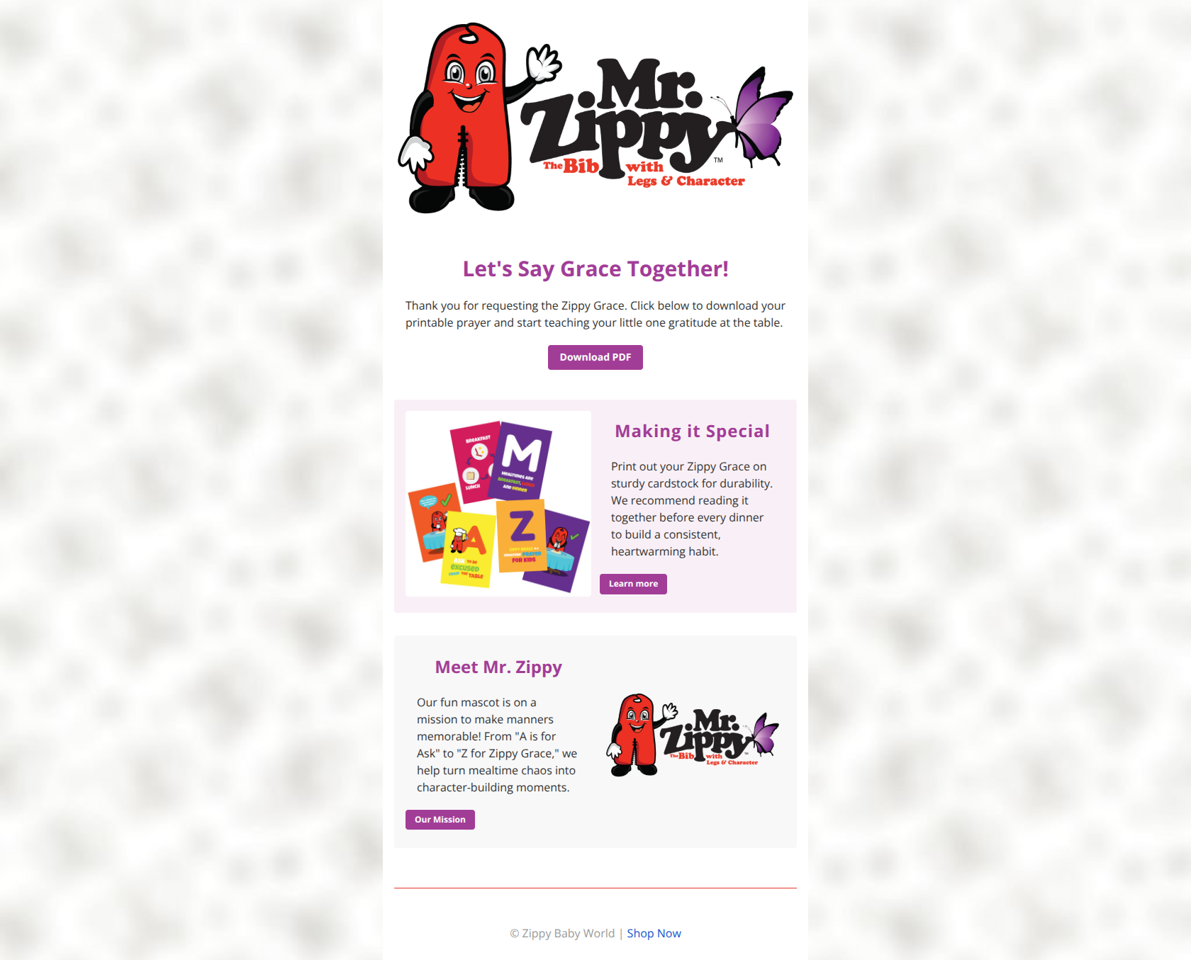 This email successfully functions as a transactional delivery mechanism for the requested lead magnet ('Zippy Grace'), but it fails to capitalize on the high engagement moment to drive commercial value. While the tone and visual branding are consistent, the email lacks a strategic 'bridge' that connects the free printable to the core paid product (the bibs), leaving significant revenue potential untapped.