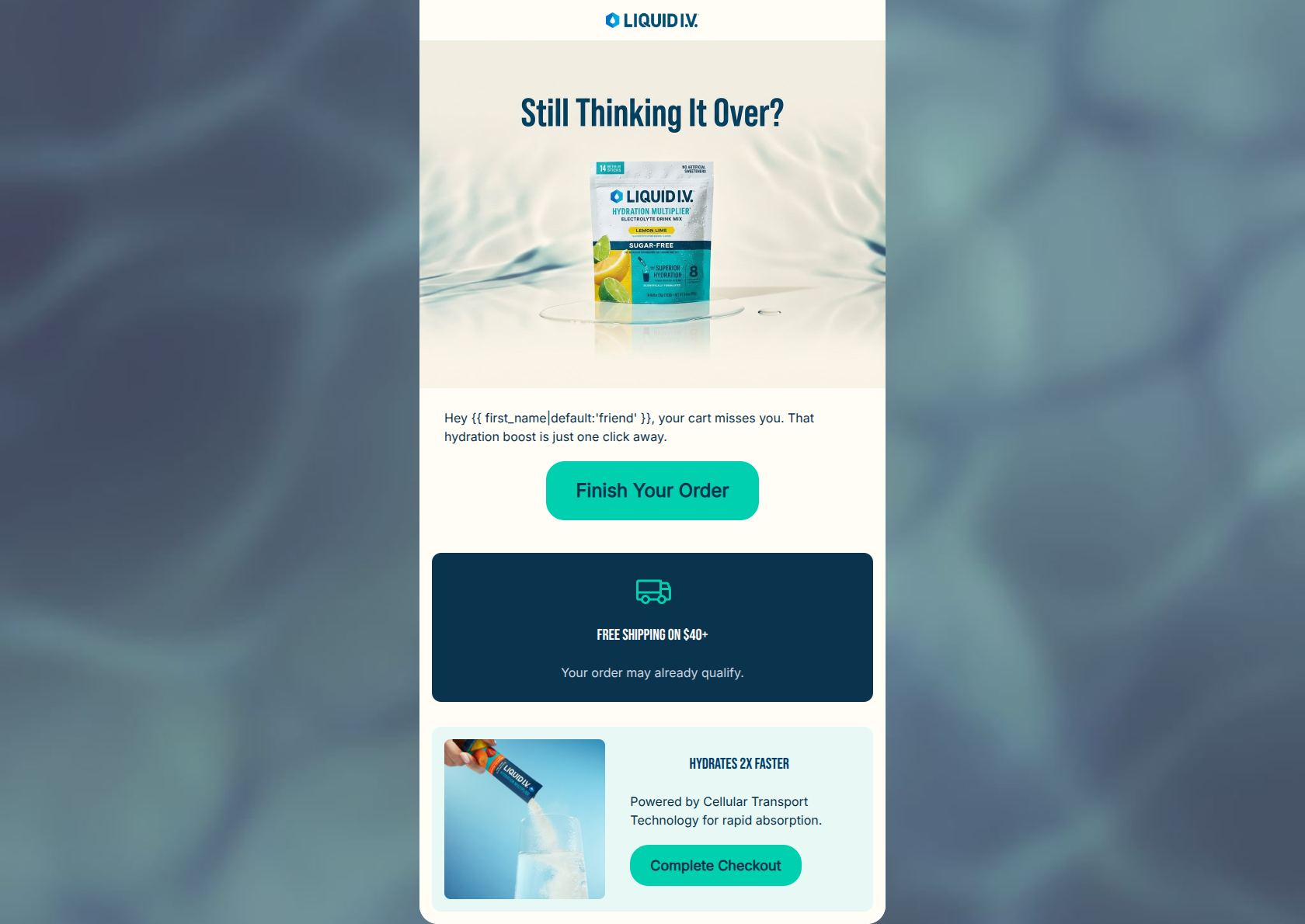78/100This cart abandonment email is structurally sound and visually clean, utilizing the brand's high-contrast color palette effectively to create clear scan paths and prominent CTAs. The inclusion of core value propositions (free shipping and rapid hydration) provides logical reasons to return to checkout. However, the copy relies heavily on generic e-commerce clichés ('your cart misses you', 'Still Thinking It Over?') that clash with Liquid I.V.'s energetic, authoritative, and performance-driven brand voice. While functional, injecting the brand's 'coach-like' persona will elevate this from a standard transactional touchpoint to a compelling conversion driver.