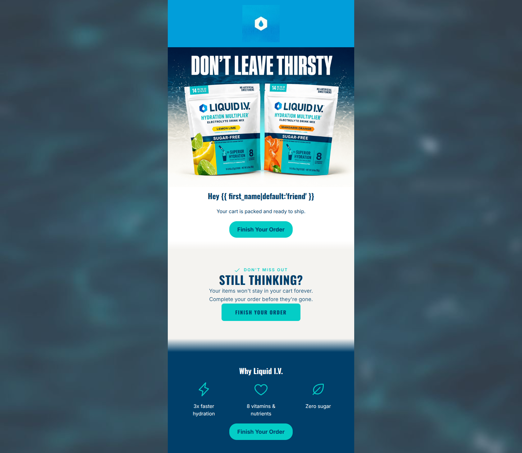 79/100This is a solid, functional cart abandonment email that adheres well to structural best practices. It features a clear inverted pyramid, strong visual hierarchy, and excellent CTA repetition pointing consistently to the cart. However, it relies heavily on generic cart-abandonment tropes ('Your items aren't reserved forever') rather than leveraging Liquid I.V.'s energetic brand voice or dynamically showing the user what they actually left behind. Elevating the copy to focus on the missed benefits of hydration and displaying the specific abandoned items would push this email from good to outstanding.
