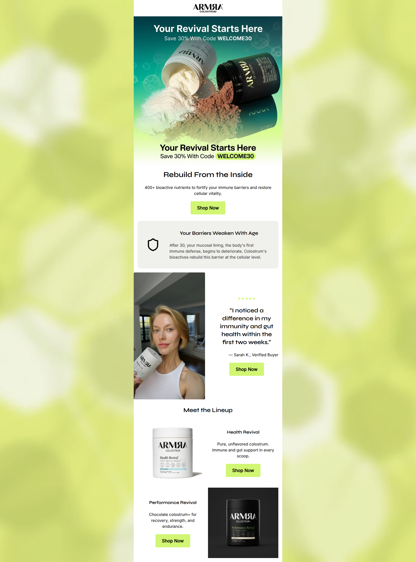 75/100The email effectively communicates ARMRA's clinical-chic brand identity and offers a compelling, science-backed value proposition tailored to a health-conscious demographic. The 30% offer is prominent and the tone hits the right notes of clinical authority. However, execution flaws—specifically the blatant duplication of hero copy and repetitive 'Shop Now' CTAs—drag down the premium feel. Fixing these structural redundancies and creating more visual contrast between sections will significantly elevate the conversion potential.