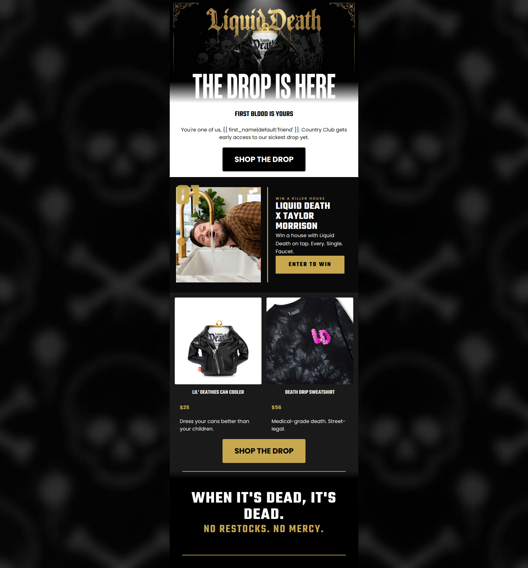 79/100The email nails the Liquid Death brand voice and aesthetic, using punchy, irreverent copy and stark imagery. However, it suffers from a split personality. The insertion of a major contest ('Enter to Win') directly in the middle of a merchandise drop announcement creates a competing primary action, diluting the focus and likely cannibalizing clicks from the main goal. Additionally, a jarring white background block in the hero section breaks visual continuity. Fixing the structural flow and unifying the CTA strategy will significantly improve conversion focus.
