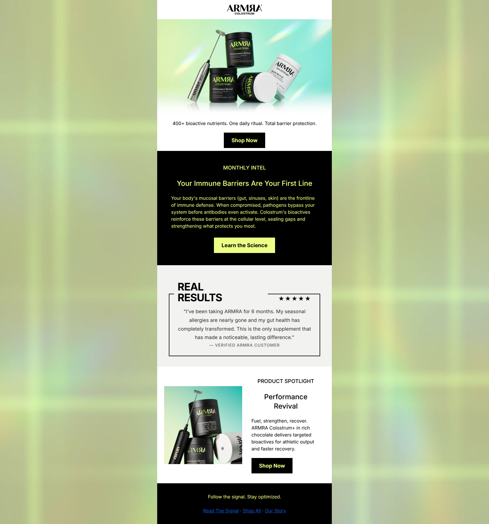 71/100This email successfully captures ARMRA's stark, futuristic, and clinical brand aesthetic. Visually, it is striking and clearly communicates premium positioning. However, from a conversion standpoint, it acts more like a static brand brochure than a persuasive direct-response vehicle. The email suffers from generic CTA copy, a lack of a cohesive narrative tying the educational content to the product spotlight, and poor scannability due to center-aligned text blocks. To elevate this from a visually pleasing asset to a high-converting email, the copy needs sharper hooks, and the sections must build a singular, compelling argument for the user to click.