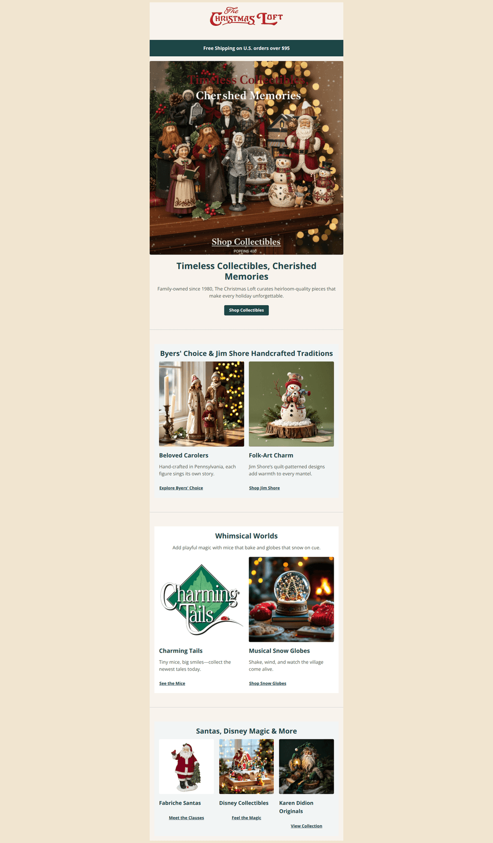 Well-branded, visually warm collectibles email with a strong hero and clear sections. Biggest opportunities are CTA prominence and link-target alignment, adding a concrete offer/urgency, and light personalization for collectors. Tightening copy and making modules more conversion-oriented will increase clicks and revenue.