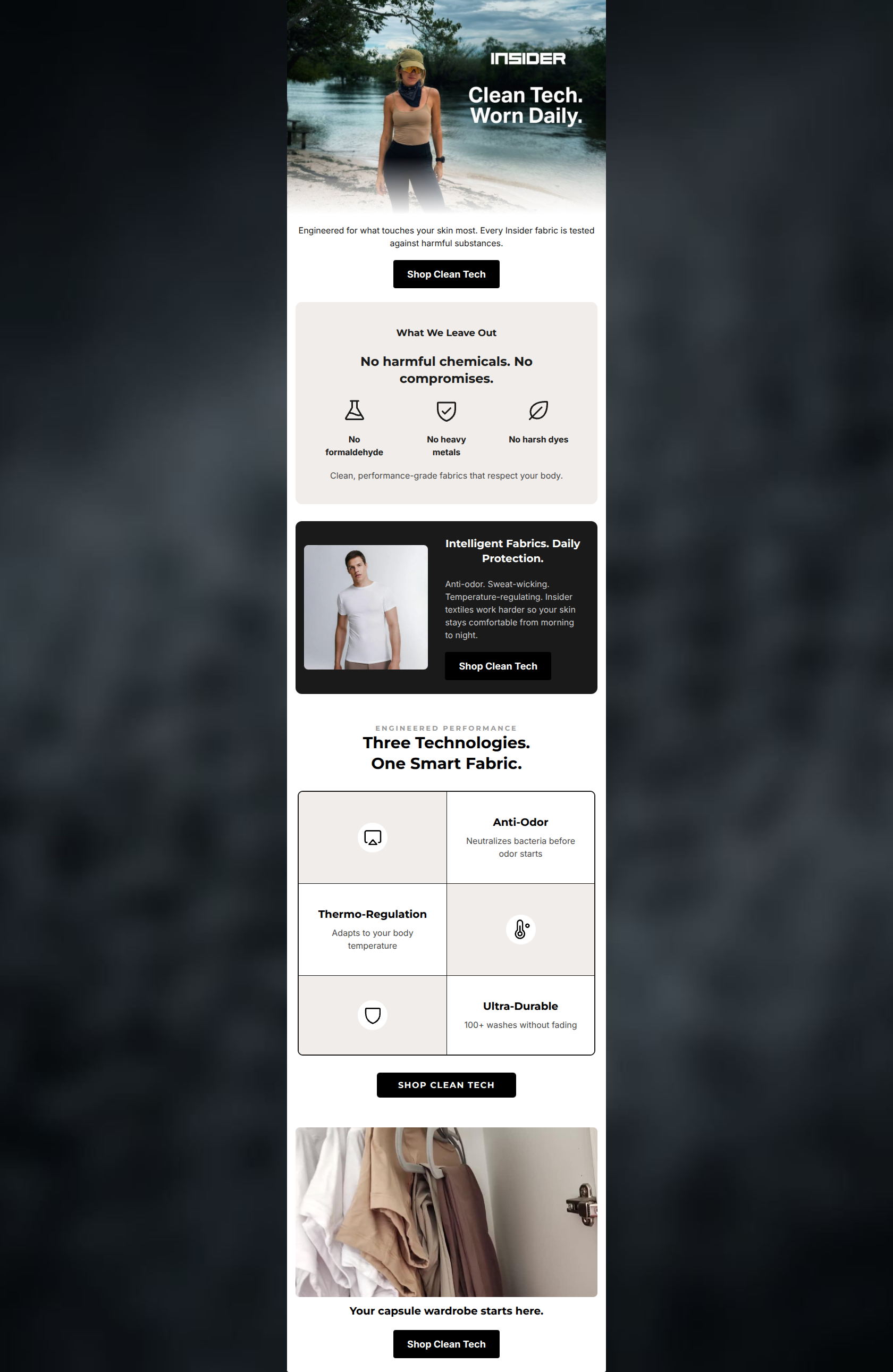 This email effectively communicates Insider's core value proposition of clean, high-performance techwear, matching the brand's pragmatic and objective tone. However, structural decisions and a critical color contrast failure severely hinder its conversion potential. By leading with 'what we leave out' instead of the direct benefits of the clothing, the email forces the reader to work harder to understand why they should buy. Fixing the contrast issues and reordering the narrative flow will significantly improve click-through rates.