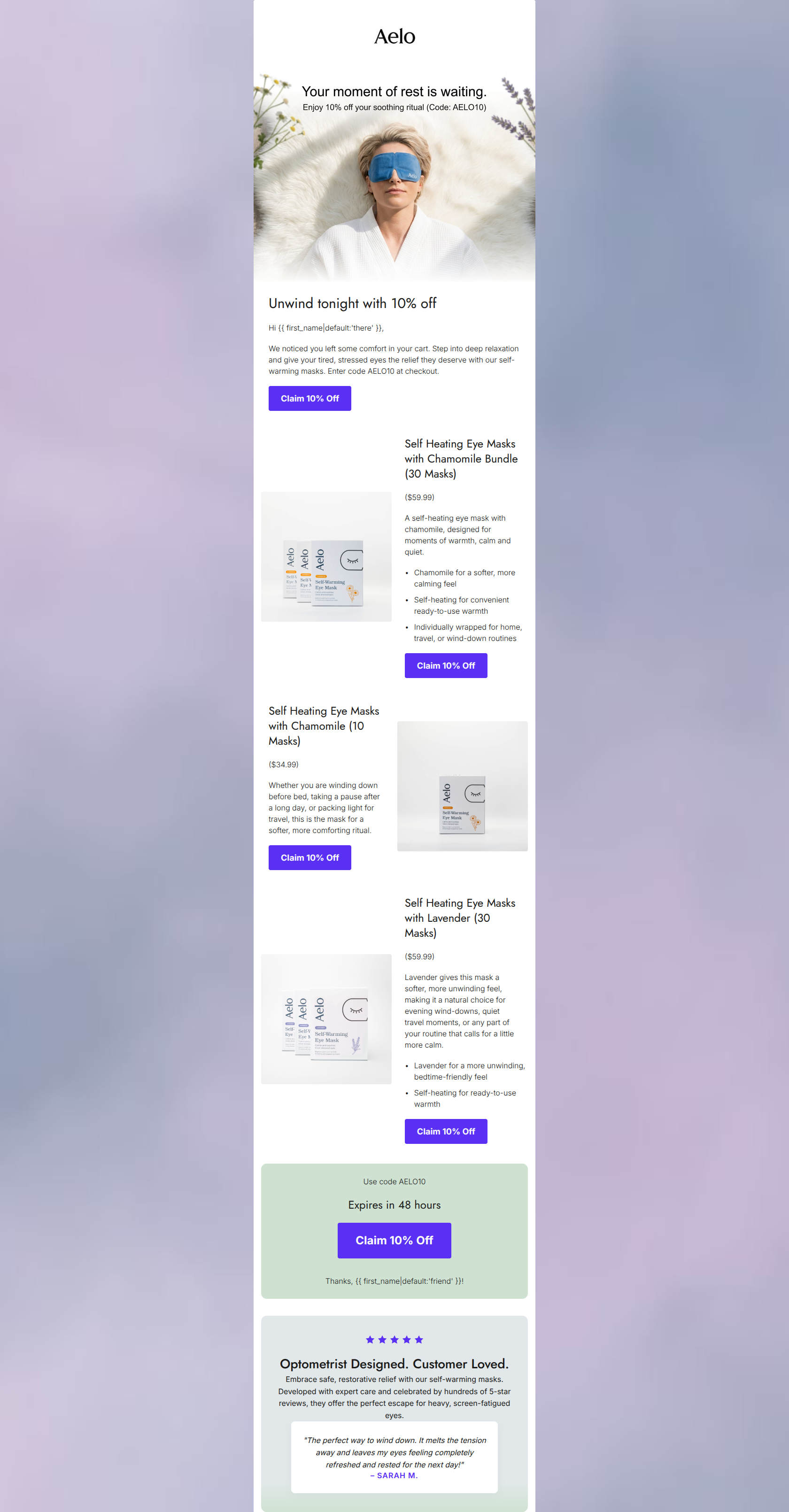 69/100While visually aligned with Aelo's serene and minimalist brand guidelines, this email suffers from an identity crisis. It opens as a cart abandonment email ('We noticed you left some comfort in your cart') but immediately transitions into a generic catalog blast featuring multiple product variants. This creates cognitive friction: instead of driving a singular, high-intent action (returning to the cart), it forces the user into a browsing mindset. The beautiful aesthetic and strong tone are undermined by repetitive, generic Calls to Action and a lack of dynamic personalization.