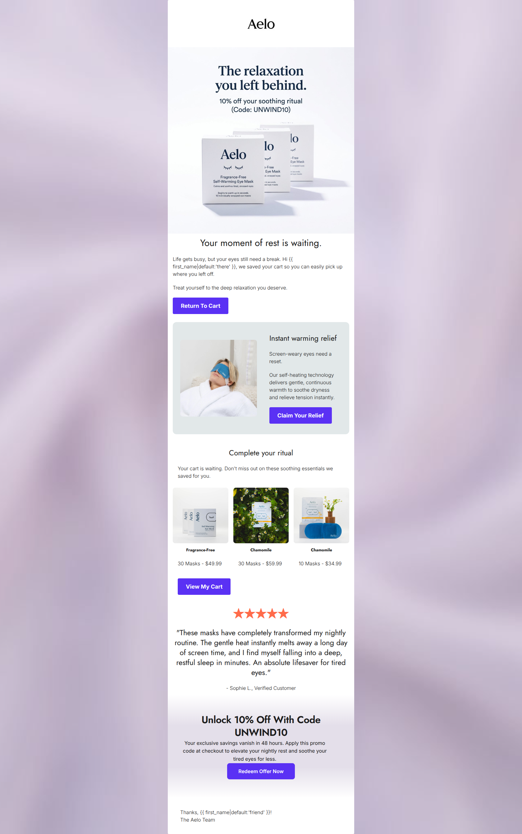 A visually calming and on-brand cart abandonment email that stumbles on structural flow and CTA consistency. While the tone perfectly captures the 'spa-like' essence of Aelo and speaks directly to the customer's pain points, the placement of the abandoned items below a generic benefit block delays the primary conversion goal. Additionally, burying the discount code in an uncopyable image and scattering four different CTA phrases creates unnecessary cognitive friction for the reader.