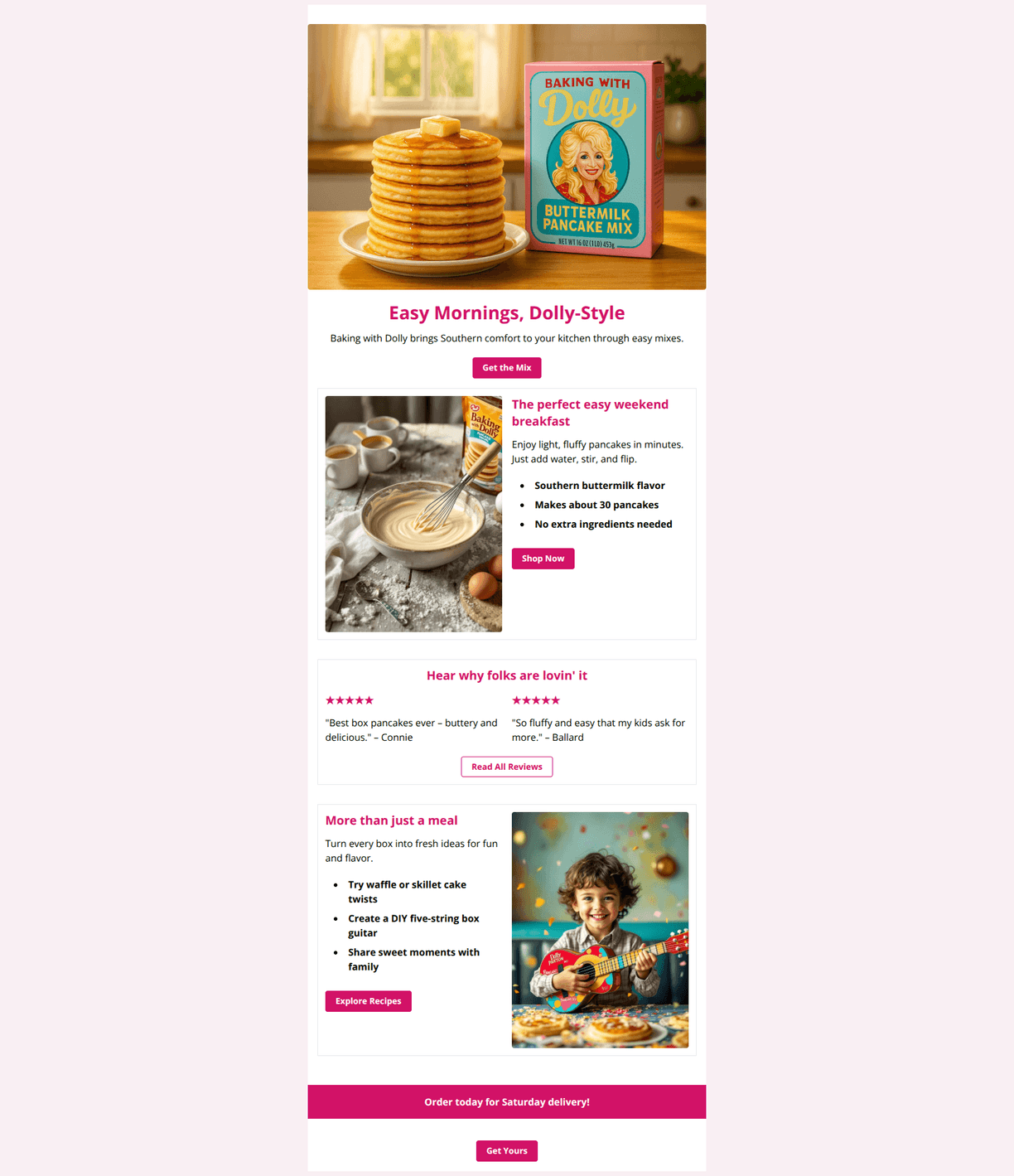 Strong, brand-right email with appetizing imagery, clear benefits, and social proof. Biggest opportunities are to tighten the buying path (link directly to Where to Buy), clarify the delivery promise, and surface rating/quantity info above the fold. Adding light personalization or retailer proximity cues would further lift conversion.