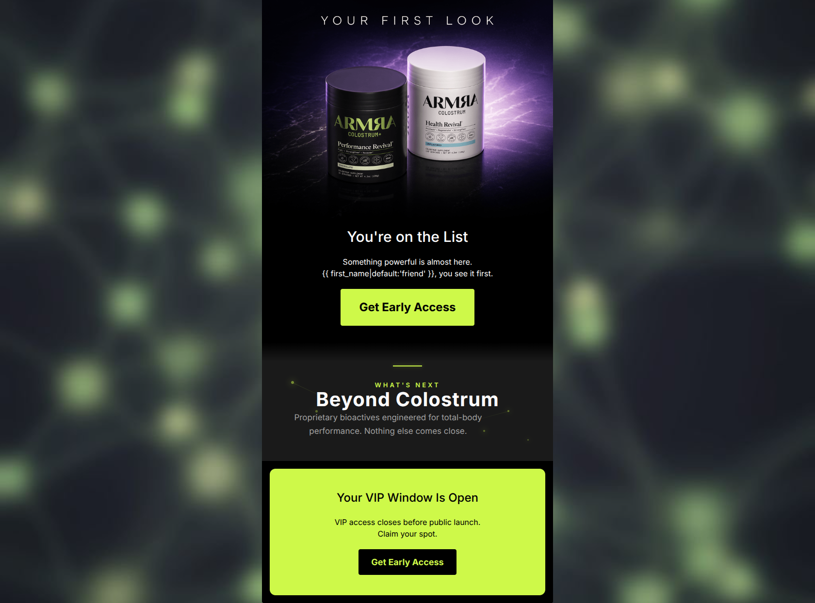 76/100This teaser email successfully generates curiosity through a bold, high-contrast visual layout and highly scannable, concise copy. The structural execution is strong, particularly the clear, repetitive use of the primary CTA. However, the email falls short on brand alignment and logical consistency. The visual and written tone leans heavily into generic 'hype' (electric lightning effects, 'nothing else comes close'), which directly conflicts with ARMRA's sophisticated, clinical, and science-backed brand voice. Furthermore, a logical contradiction in the messaging ('You're on the list' vs. 'Claim your spot') creates unnecessary cognitive friction for the reader.