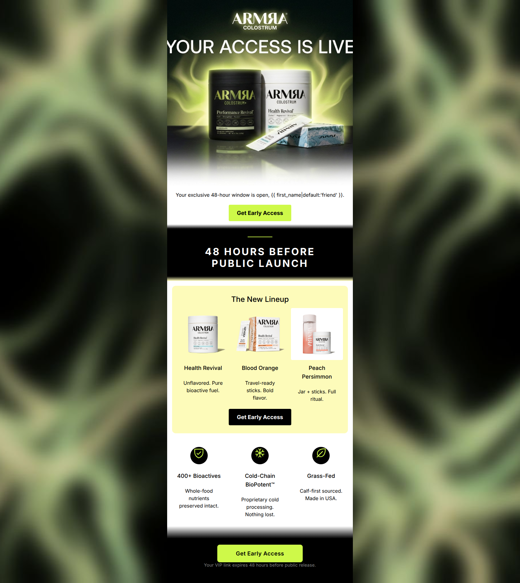 78/100This email effectively leverages urgency and a minimalist design to drive clicks for an exclusive launch. The scannability is excellent, relying on punchy copy and structured grids rather than walls of text. However, the campaign suffers from a slight disconnect in visual consistency (varying CTA colors and off-brand background hues) and a lack of clarity regarding what exactly makes this 'The New Lineup'. By tightening the visual identity and clarifying the value proposition of the launch itself, this email could perform significantly better.