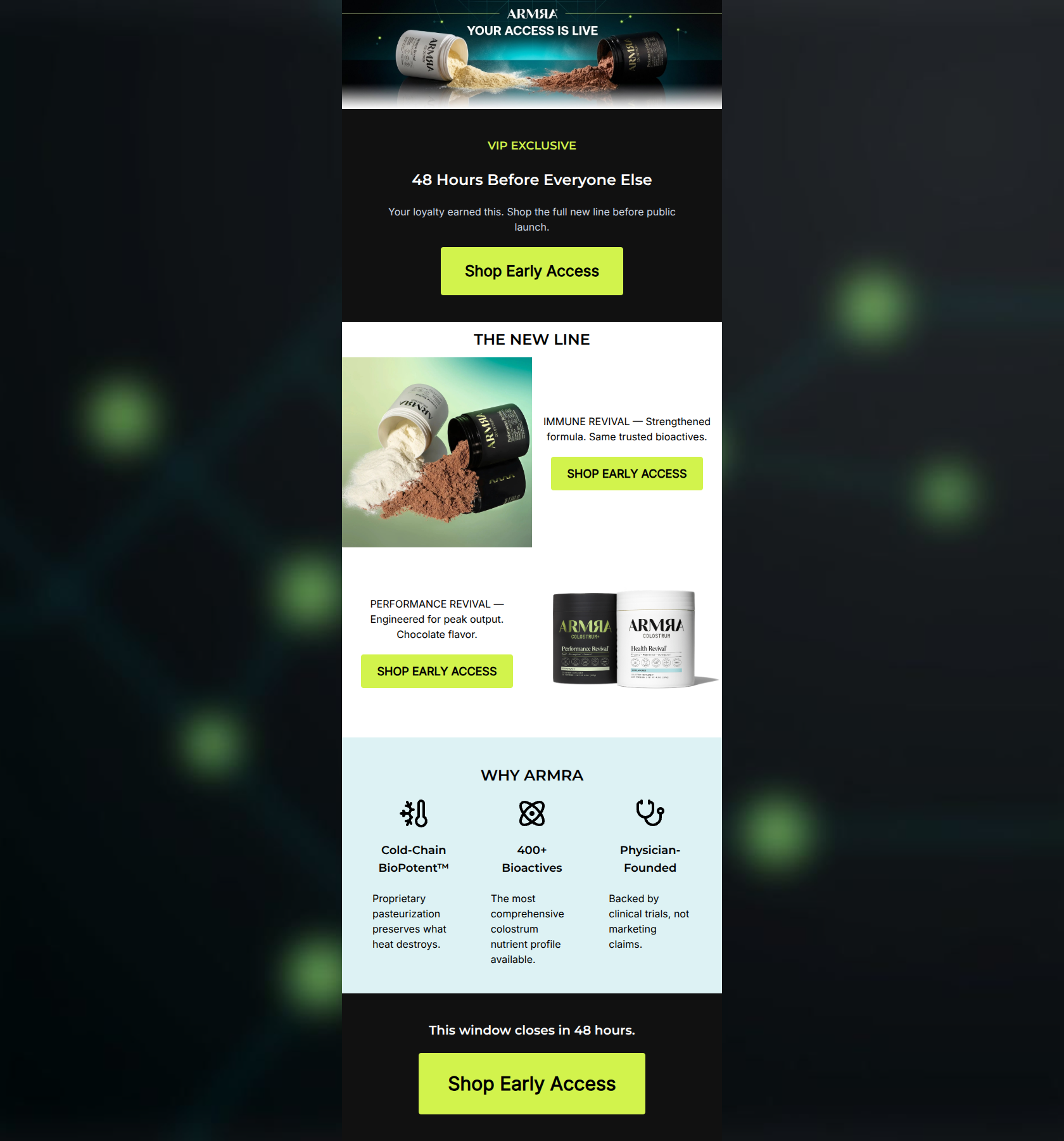 74/100This VIP Early Access email effectively leverages exclusivity and urgency to drive action, utilizing the brand's striking high-contrast color palette well. The flow from the 'VIP' hook down to the core brand value propositions is logical. However, the execution within the product showcase section falls short of ARMRA's 'premium clinical' positioning. Visual inconsistencies between product shots, muddy typographic hierarchy in the descriptions, and vague marketing copy for the new line dilute the impact. To push this from competent to exceptional, the email needs tighter visual consistency and product copy that bridges the gap between the 'new formula' and tangible customer benefits.