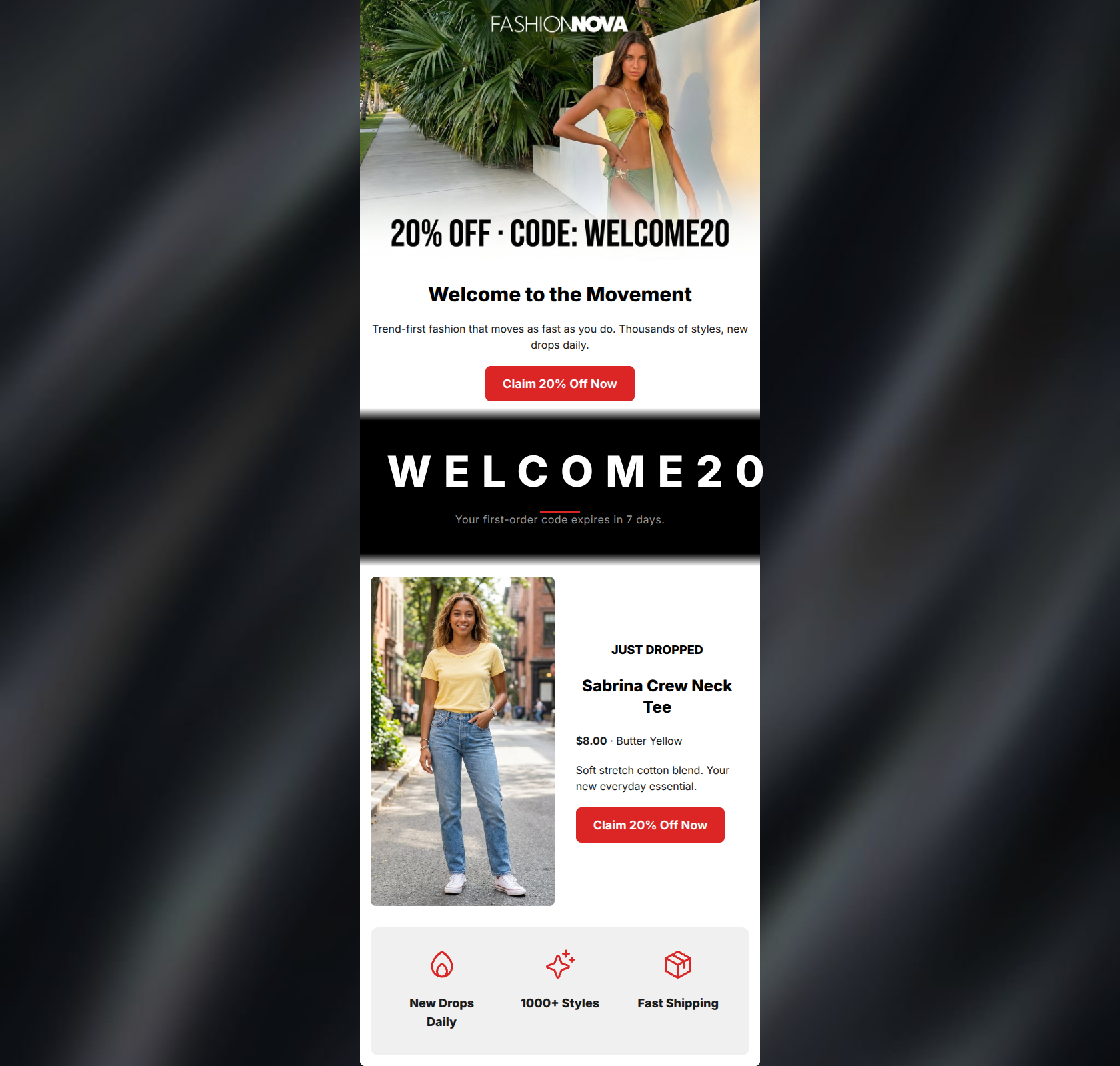 This welcome email effectively communicates a strong 20% off offer with clear, consistent Call-to-Actions. However, it suffers from severe redundancy in presenting the discount code and a significant disconnect from the brand's core identity. The tone is far too subdued ('Welcome to the Movement') for a loud, aggressive brand like Fashion Nova, and featuring a basic crew neck tee as the sole product example fails to sell the aspirational, 'Instagram-baddie' aesthetic the target audience craves.