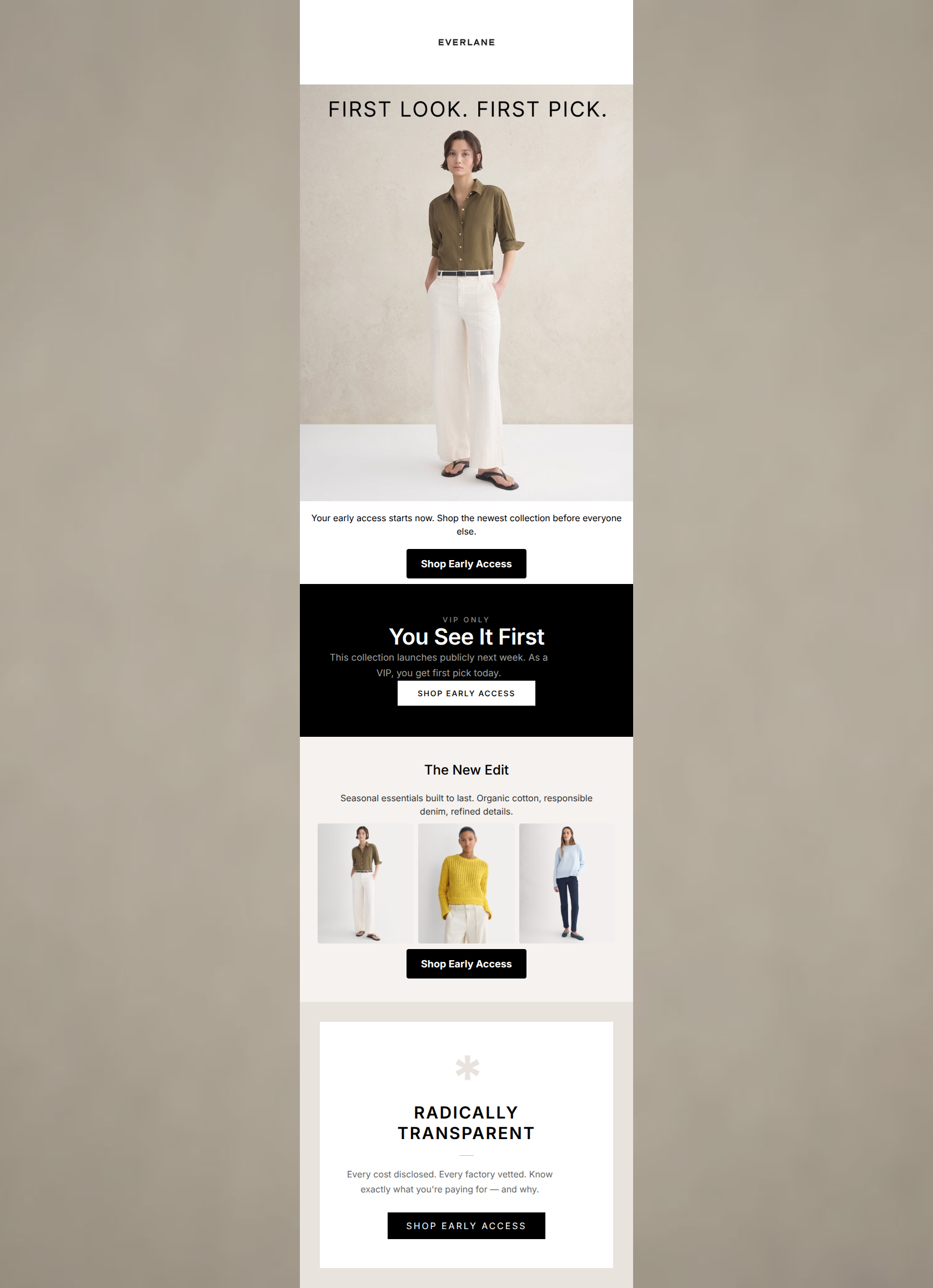 This email effectively leverages Everlane's minimalist aesthetic and strong CTA consistency to drive action, but it suffers from significant structural redundancy. The transition from the hero to the first content block repeats the exact same 'early access' message, creating unnecessary cognitive load and wasting prime vertical real estate. While the visual execution is clean, the copy needs tightening to move the user more efficiently from the 'VIP' hook to the actual product offering.