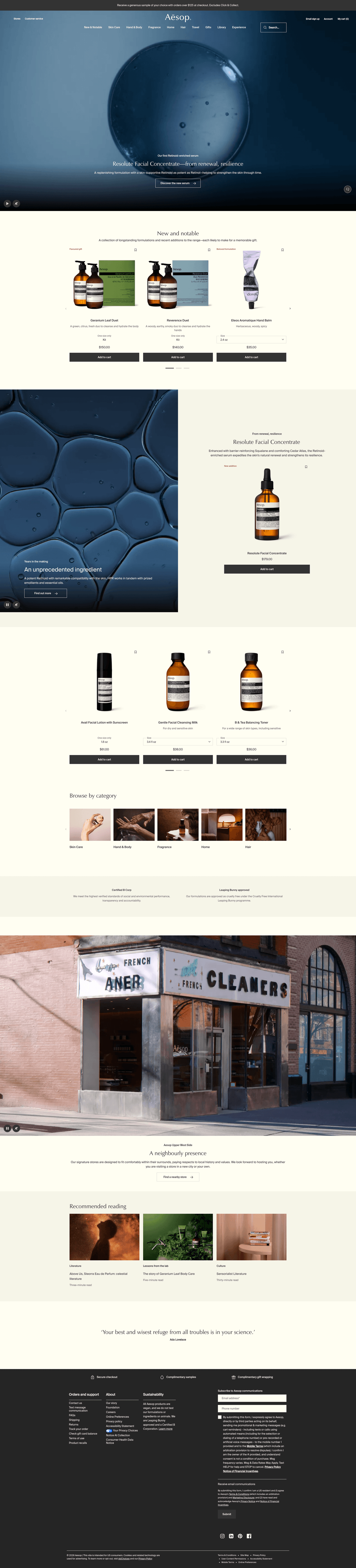 Aesop is the antithesis of a dropshipping store. Every element—from the custom packaging to the B-Corp status and physical architecture—signals a deeply established, high-end brand.