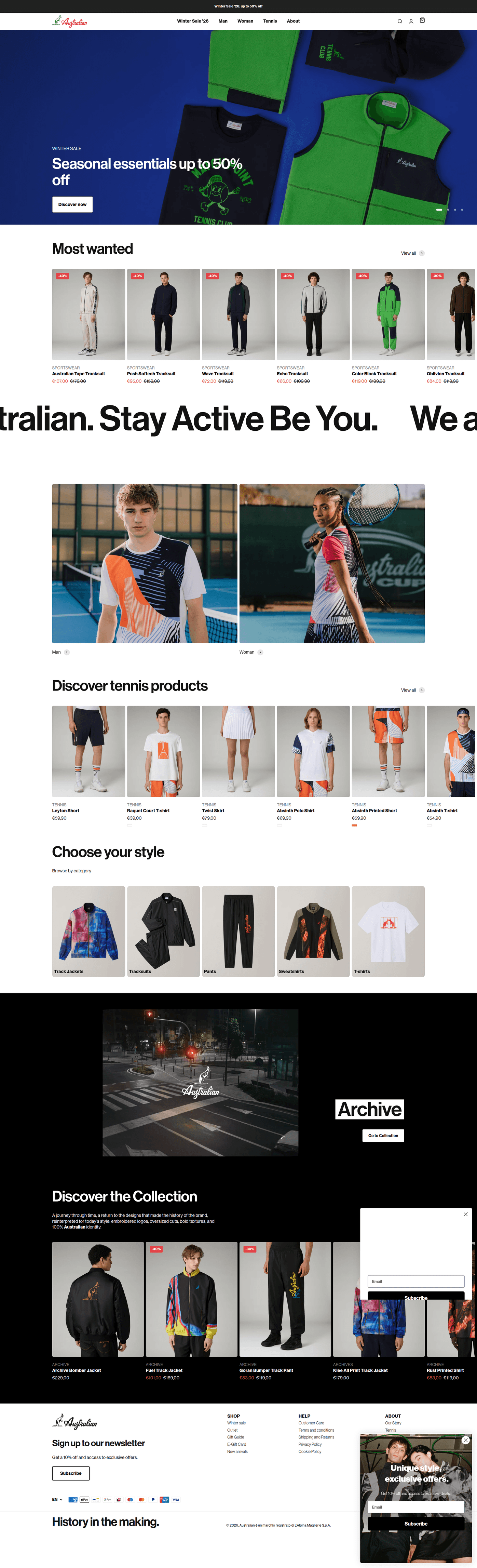 This store scores very low (good) on the 'dropshippey' heuristic. It features high-quality custom photography, an established brand logo, consistent high pricing, and professionally managed collections (Archive, Tennis), indicating an authentic, premium retail operation.