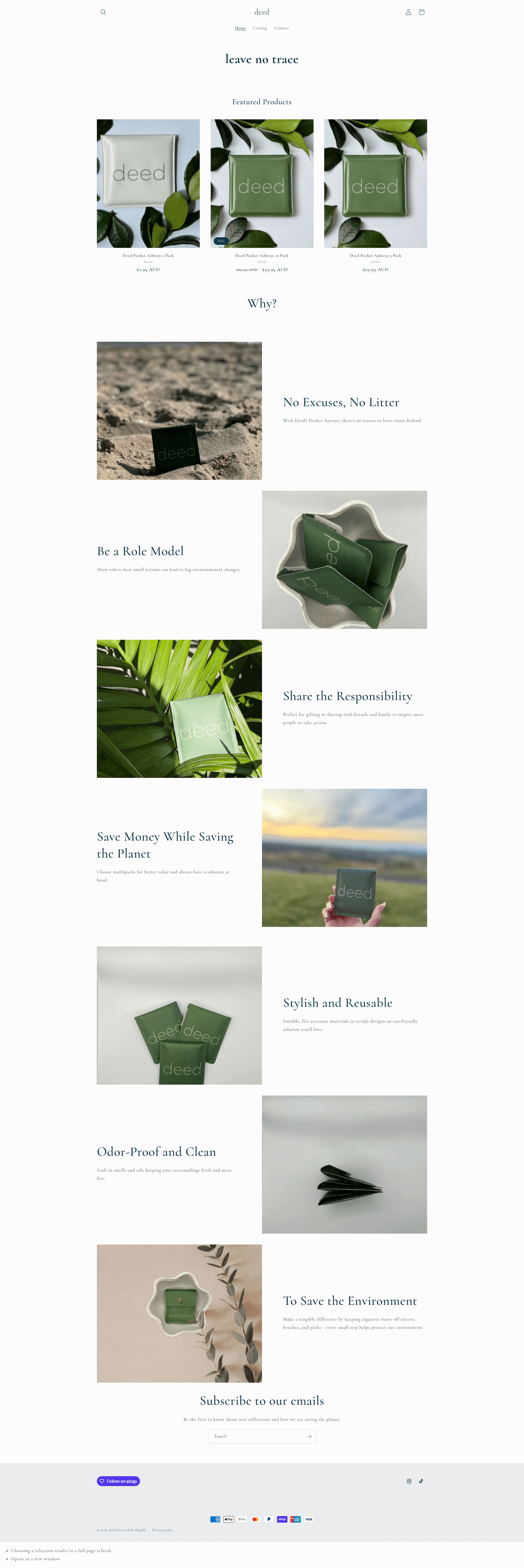 The text-only hero 'leave no trace' lacks immediate product context and a clear call-to-action.