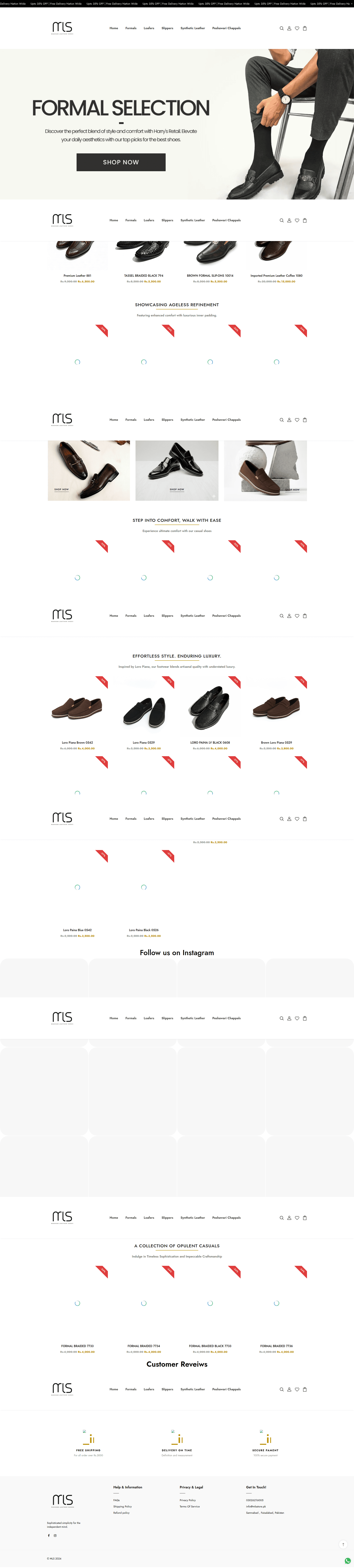 The store sells specialty goods (leather shoes), features professional, custom-looking product photography, promotes nationwide delivery in Pakistan, and provides extensive contact information, minimizing the generic dropshipping feel.