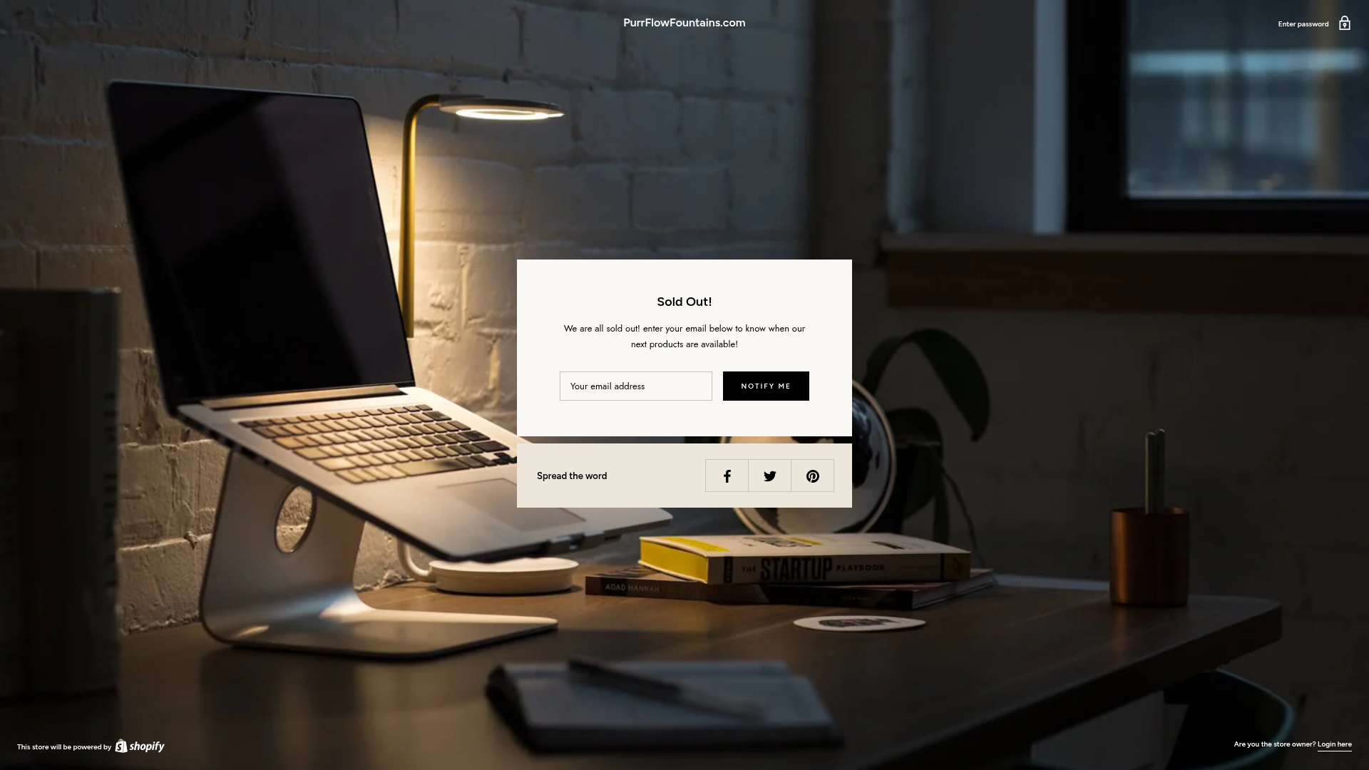 The site uses a specific product-rich URL but lands on a locked page with a generic office stock photo. This is a hallmark of a low-effort dropshipping store that was either quickly shut down or never properly launched.