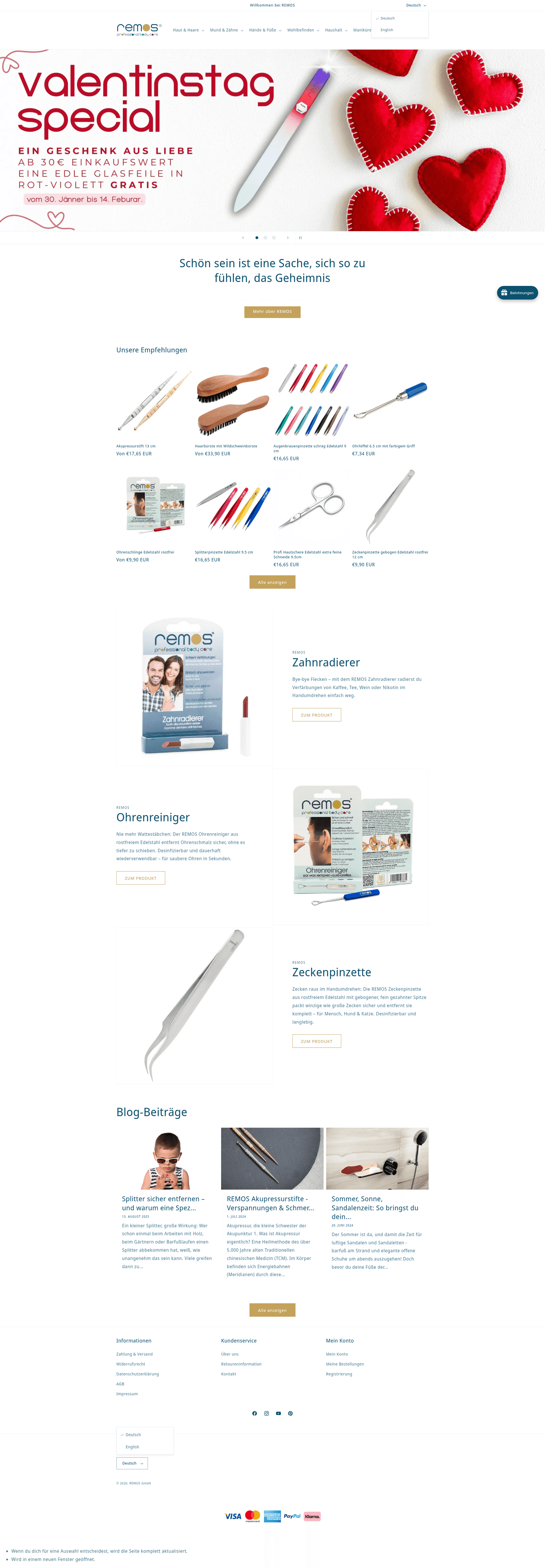 The professionalism of the navigation (R4), visible company name (REMOS GmbH), and detailed, consistent product categories push this away from the typical dropship score. However, the inconsistent photography (R1) and reliance on stock-like packaging images prevent a strong score.
