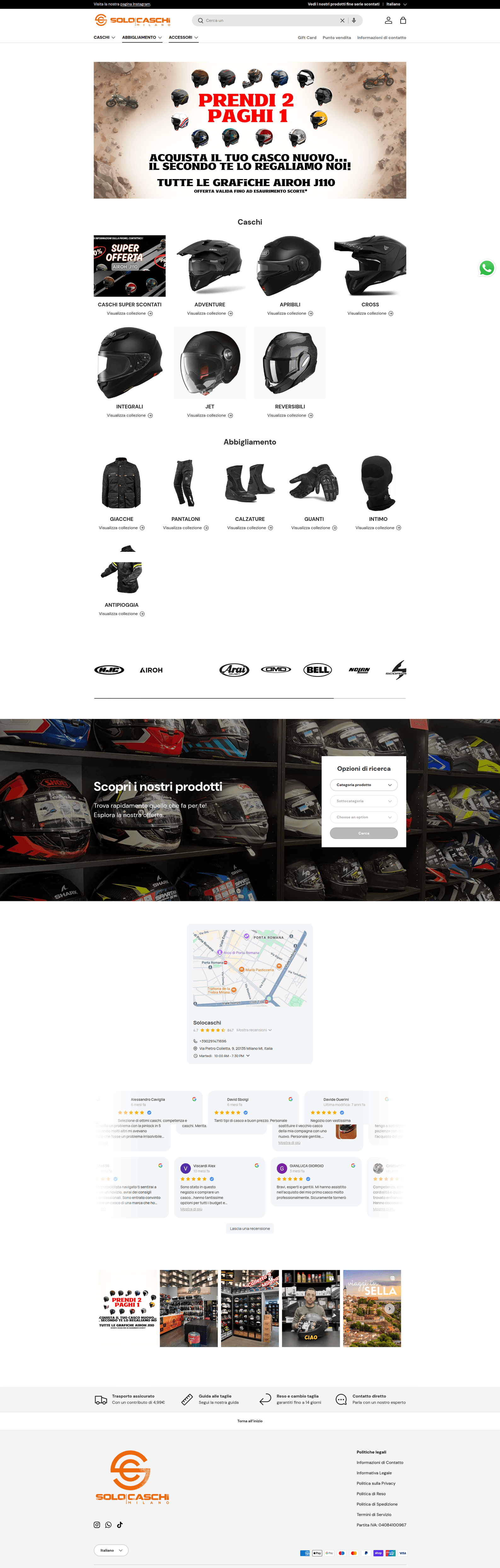 The presence of a physical store in Milan with 800+ reviews and specific brand name inventory (Shoei, Arai) confirms this is a legitimate brick-and-mortar and online retailer, not a dropshipper.