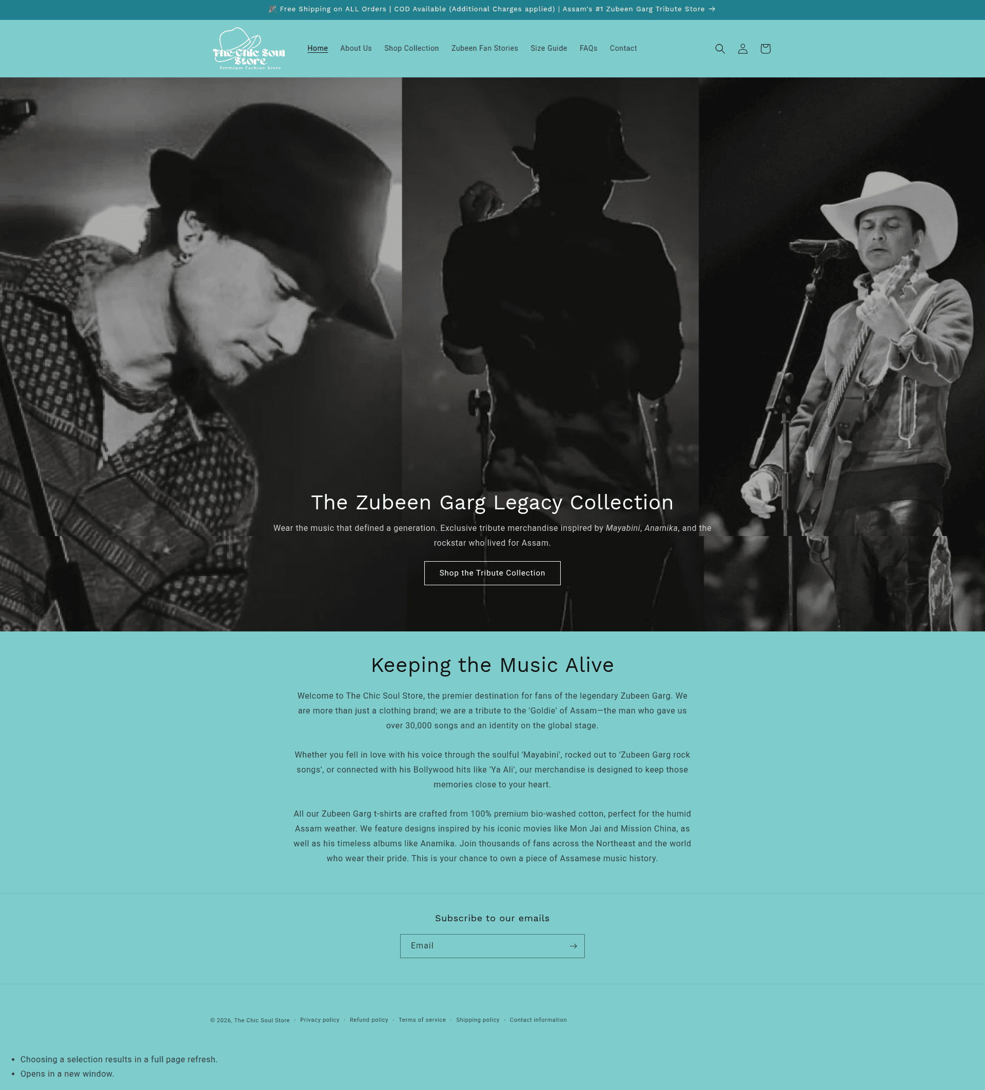 The hero section uses strong, thematic, black-and-white performance imagery of the tribute subject (Zubeen Garg). This establishes the brand's mood and niche but does not show customers wearing the merchandise or the product in context.