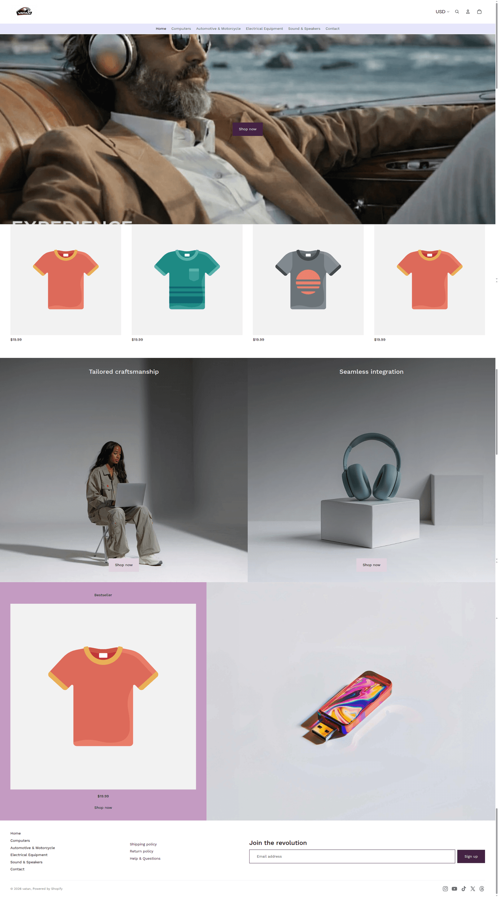 The use of generic buzzwords like 'Tailored craftsmanship' and 'Join the revolution' in a tech store with placeholder products strongly suggests a default AI-generated or theme-template content setup.